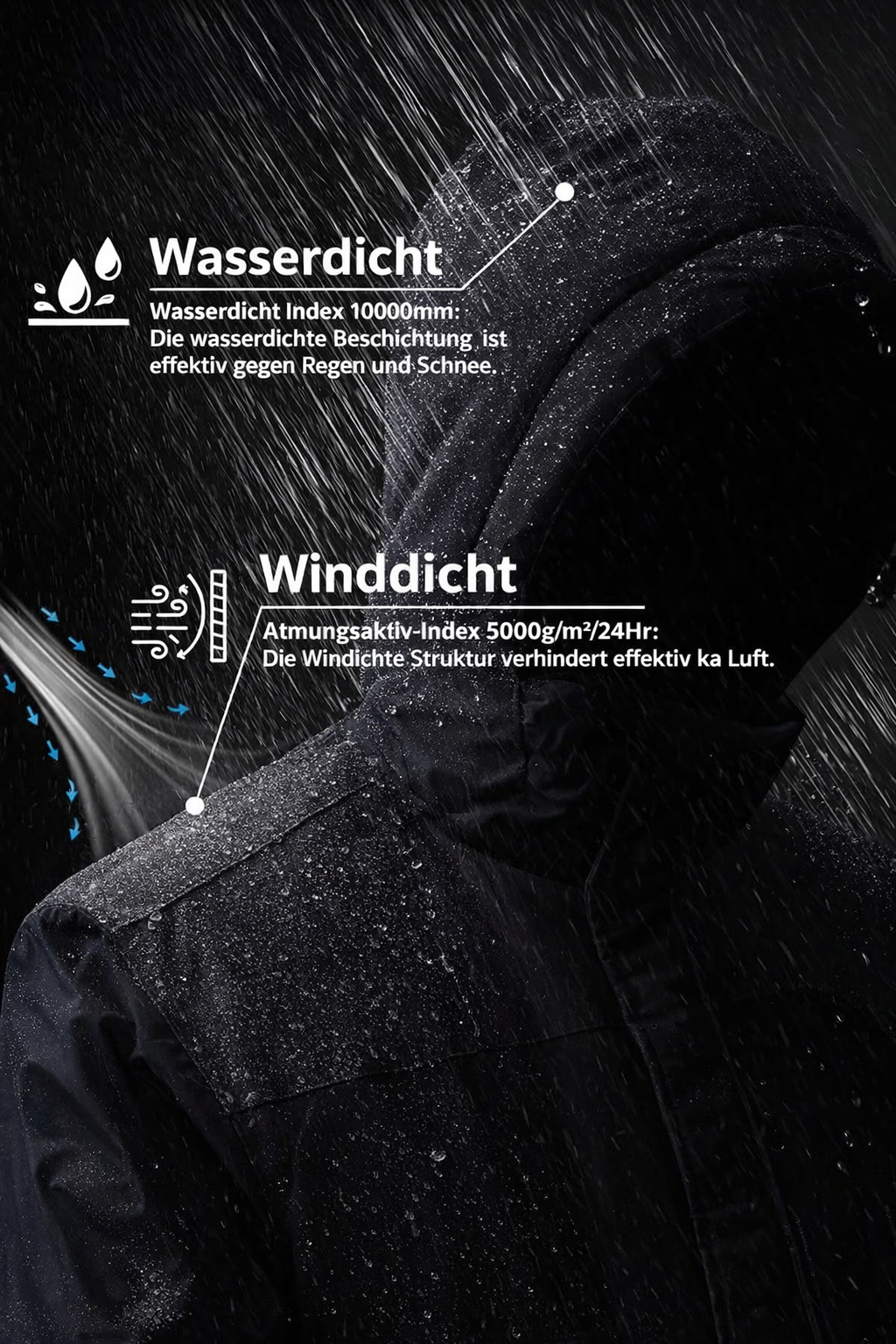 Die fortschrittliche hydrophobe Beschichtung weist starken Schneefall und Nässe ab und hält Sie bei längerem Aufenthalt im Freien trocken.