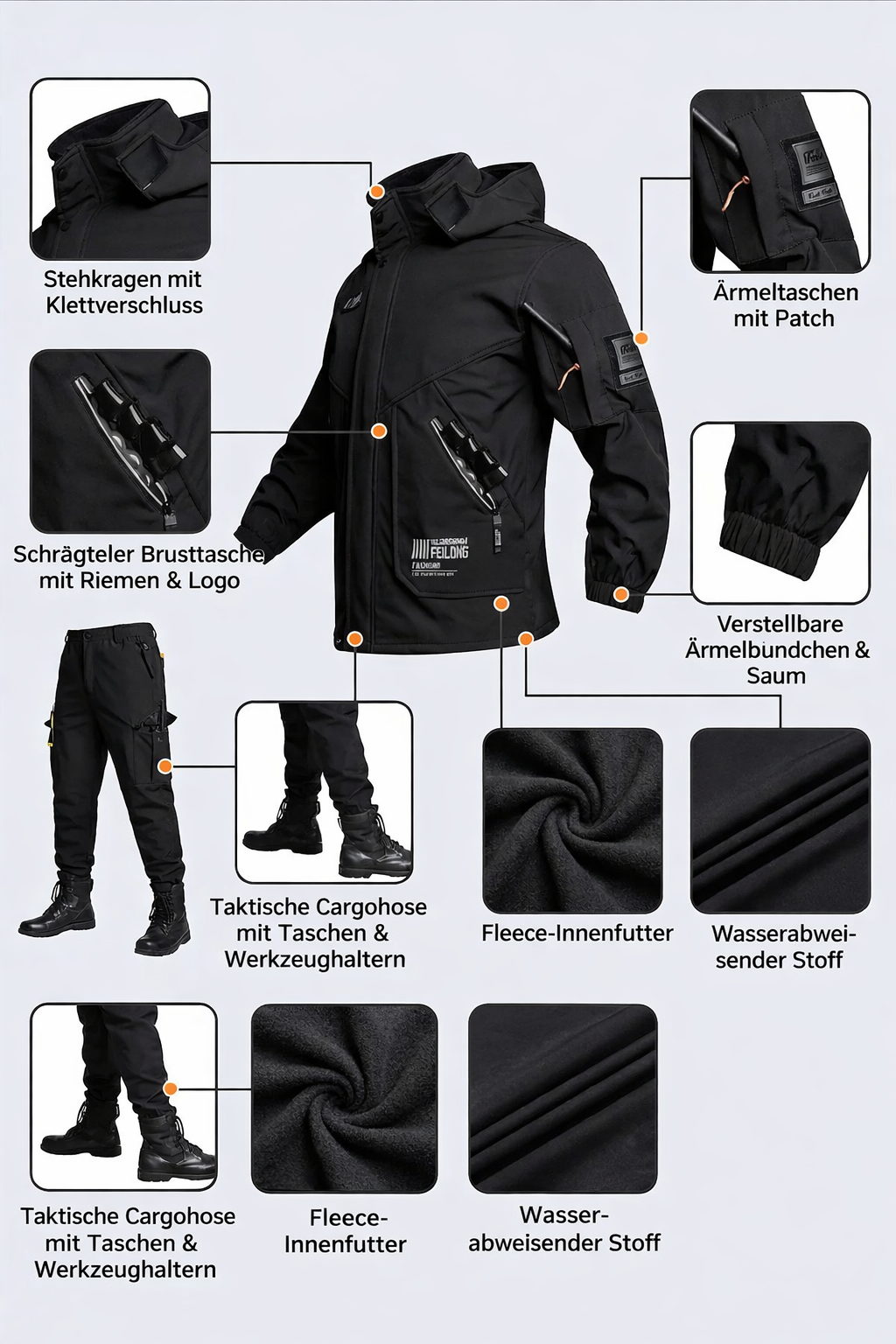 – taktisch inspiriert, diskret und praktisch für das Nötigste. - Verstellbare Bündchen und Saum