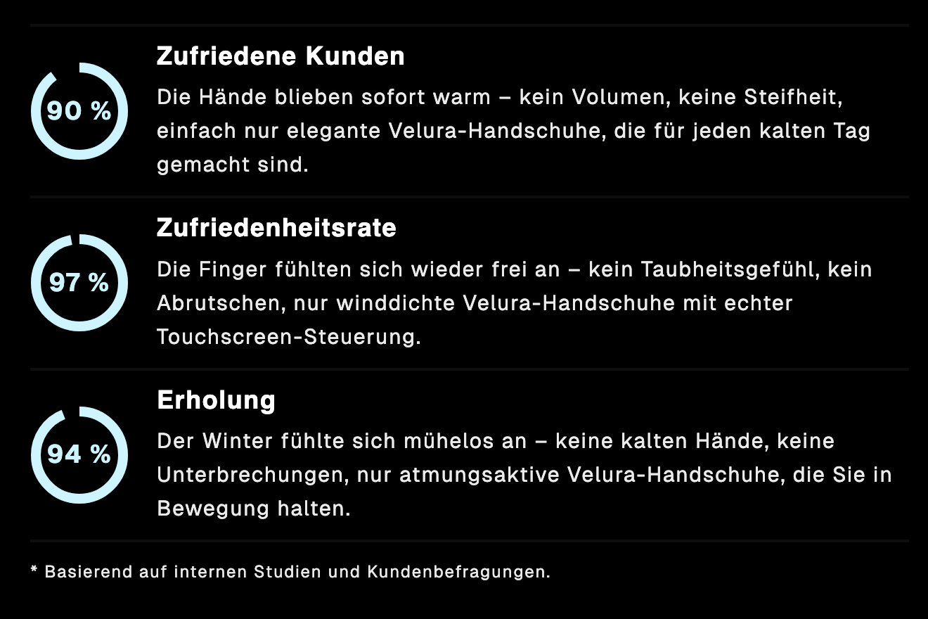Diese Handschuhe sind ein echter Gamechanger. Ich fahre jeden Morgen mit dem Fahrrad zur Arbeit, und vor den Velura-Handschuhen wurden meine Finger immer nach der Hälfte der Strecke taub. Jetzt bleiben sie die ganze Fahrt über warm, und ich kann mein Handy sogar noch für die Navigation benutzen, ohne die Handschuhe auszuziehen.